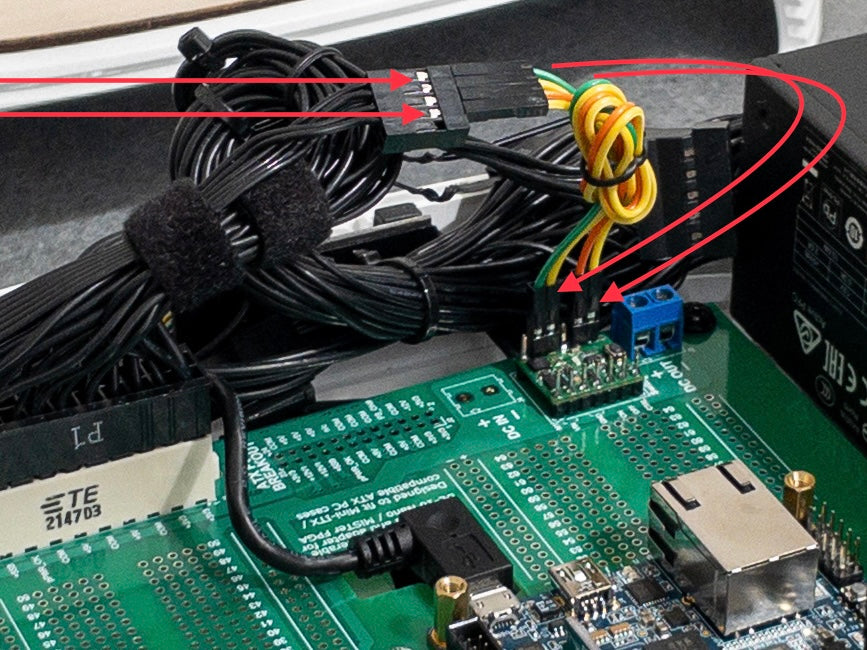 1) Soldering a DC jack to J7, Pololu 2808 module to M1 and a terminal block to J3; outputting power via a DC power pigtail into your MiSTer whenever the PC case triggers the 2808 switch.