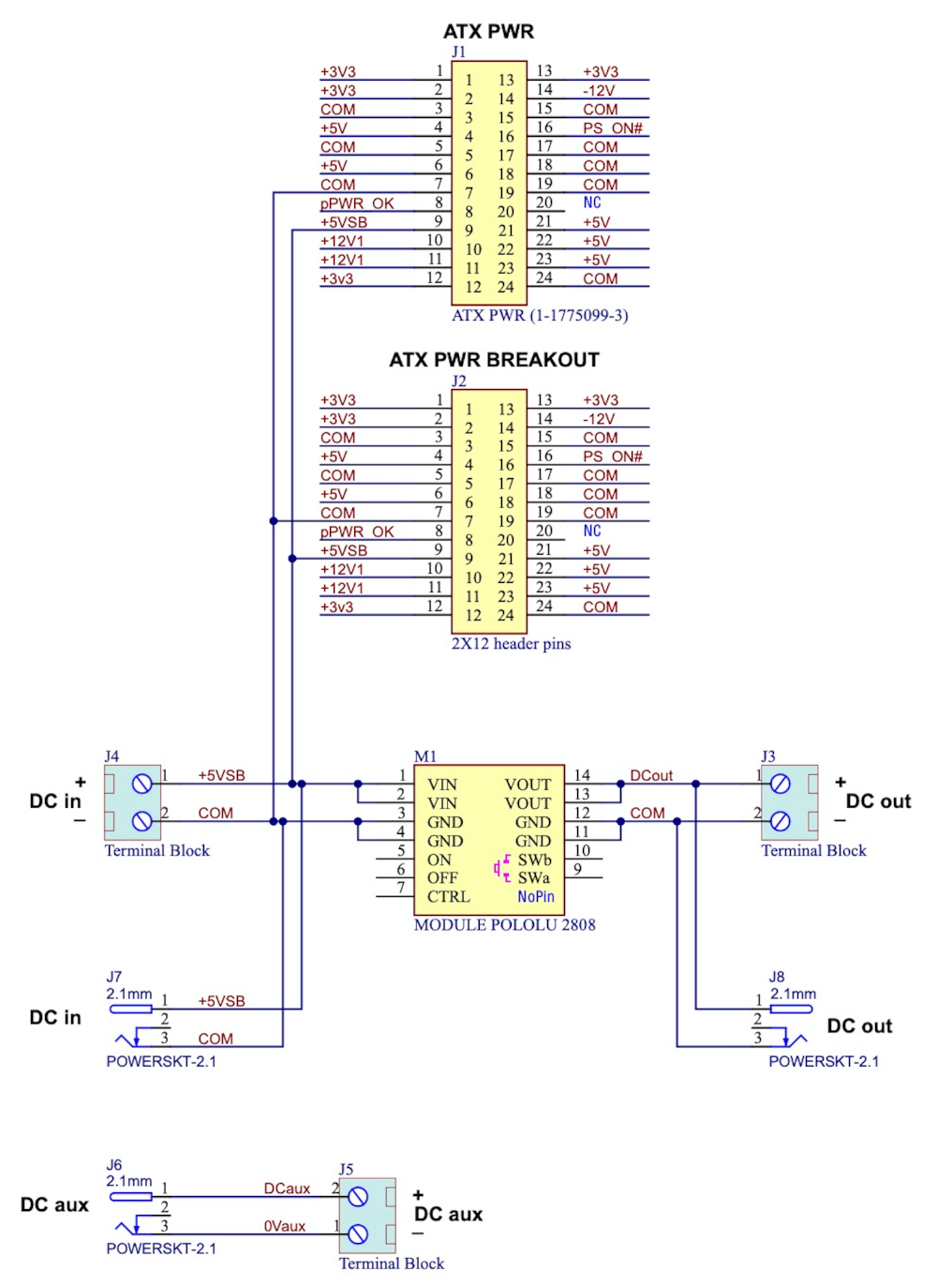As shown in the schematic at the top of this page, DC power input to the Pololu Module is incorporated into the ATLANTIS via DC jack input or the ATX +5Vsb. If an alternate power source is desired, a terminal block at J4 is also directly connected to the Vin of the 2808 module.