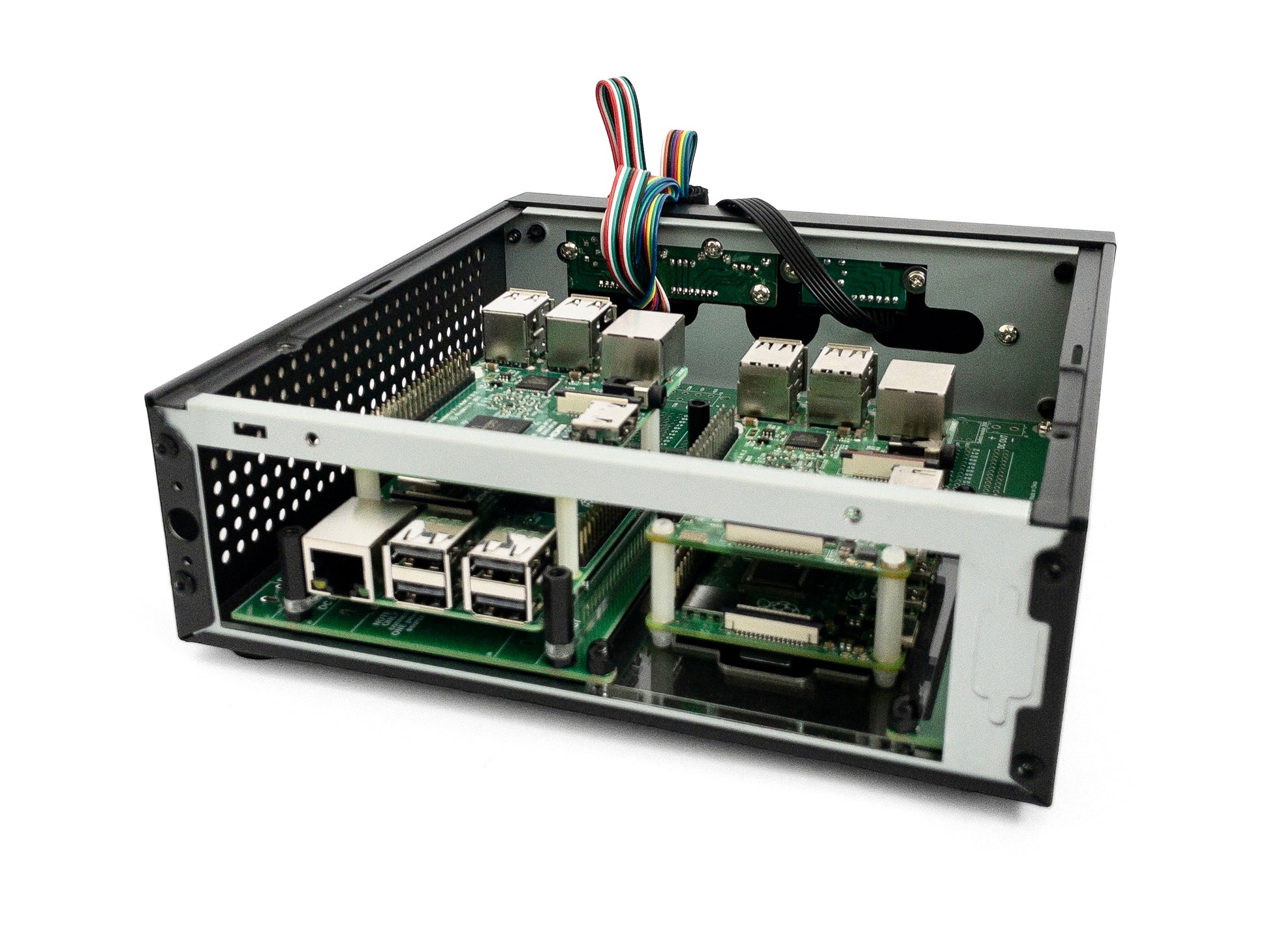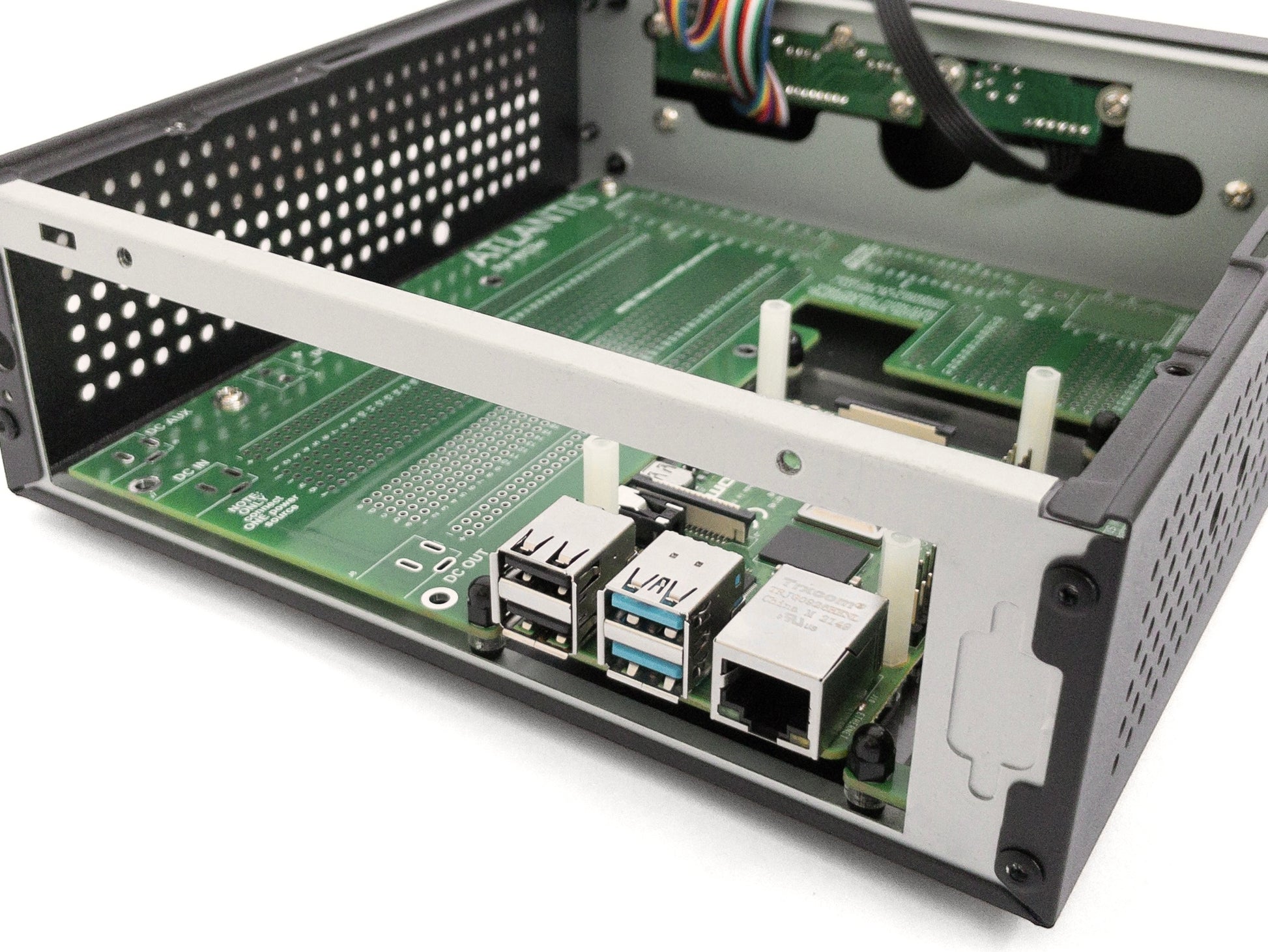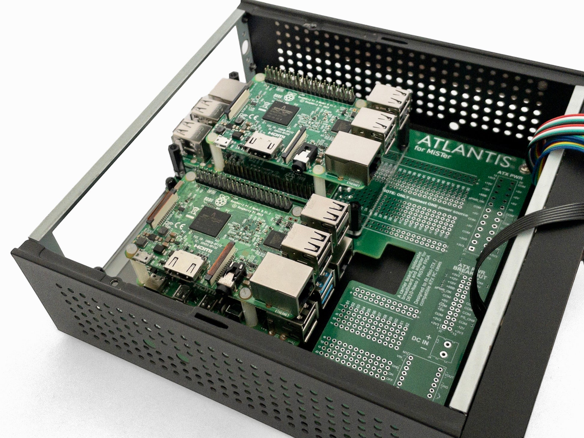 Two kits can be mounted side by side on an ATLANTIS board to build up to a 4x Raspberry Pi cluster, which can even fit inside our M06 Mini-ITX PC case!